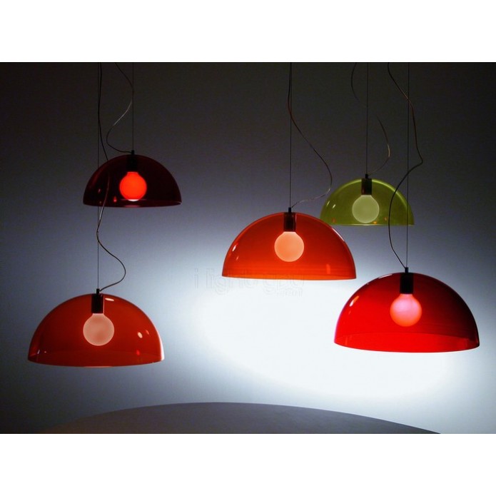 Elle se décline en 4 coloris : rouge, orange, jaune et blanc transparent pour 2 tailles : 45cm de diamètre et 55cm de diamètre.