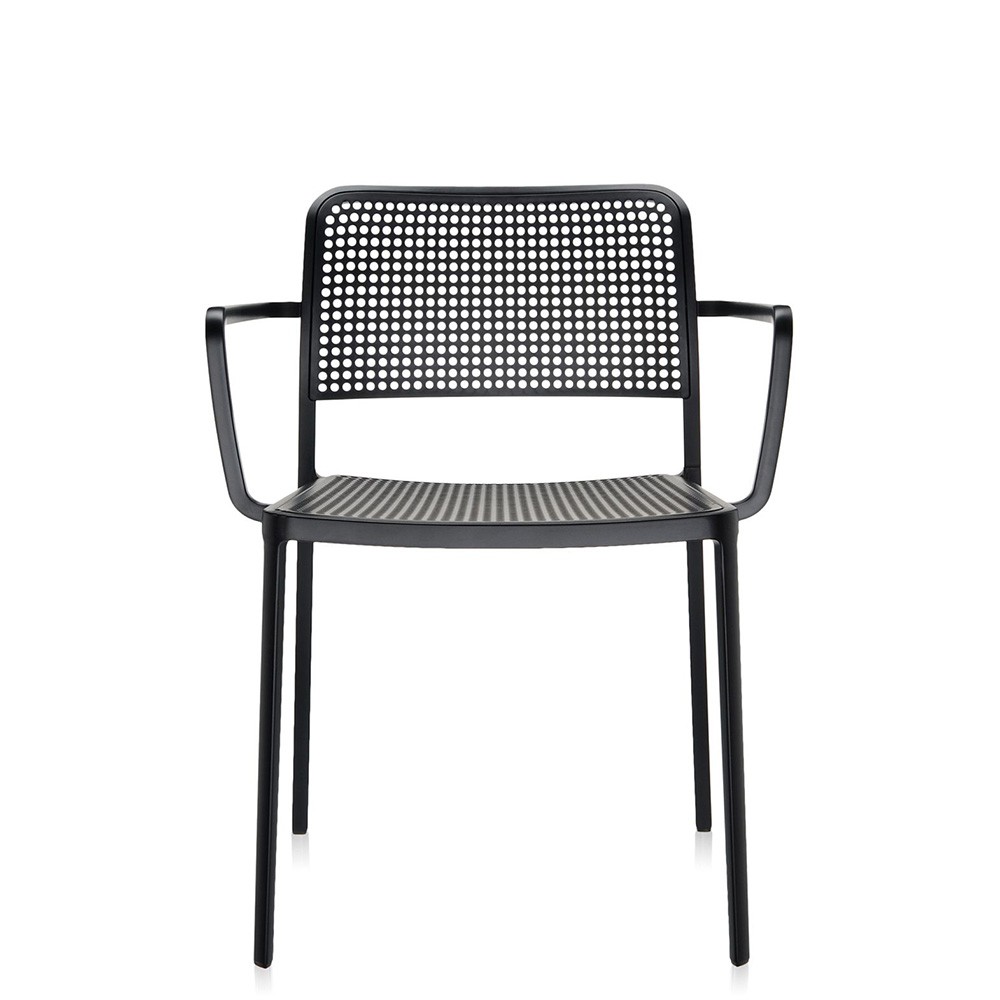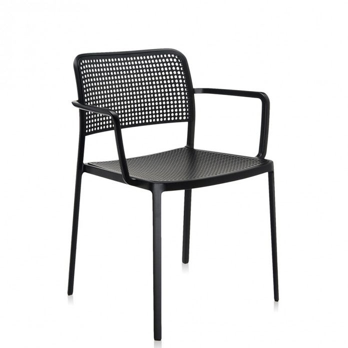 Audrey est disponible à la fois en version chaise et en version fauteuil (avec accoudoirs). Son assise et son dossier sont réalisés en plastique.