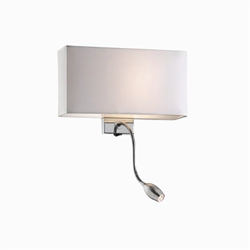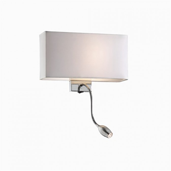 Eclairage diffus de l'abat-jour grâce à une ampoule 60W E27 et l'éclairage Led de sa liseuse grâce à une ampoule Led de puissance 1W, actionnée par un interrupteur situé sous la structure chromée.