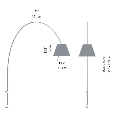 Le lampadaire déporté Lady Costanza existe en 2 versions : l'une avec dimmer sensoriel situé sur la tige du lampadaire permettant le règlement de l'intensité lumineuse sur 3 niveaux, et une version à interrupteur à pied.