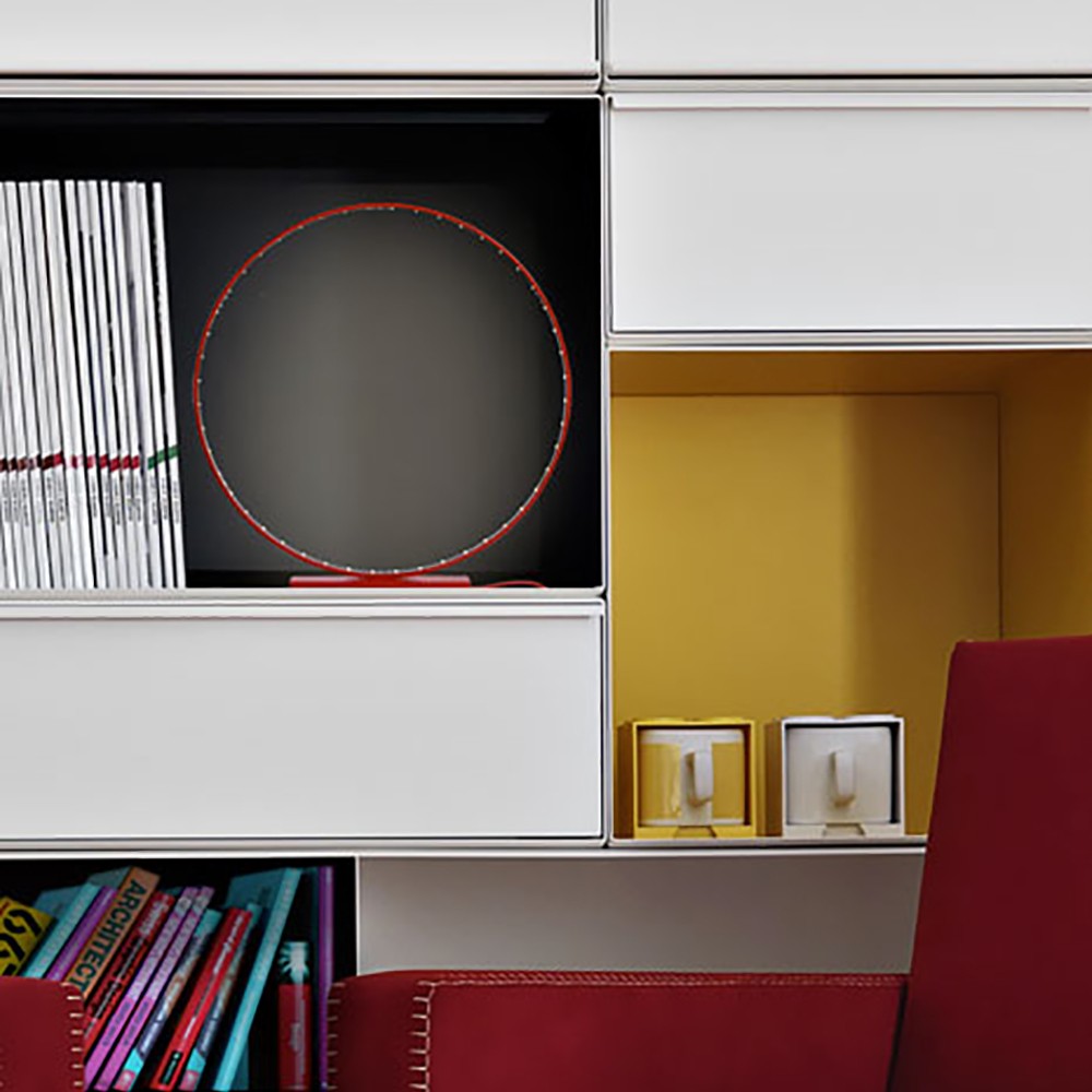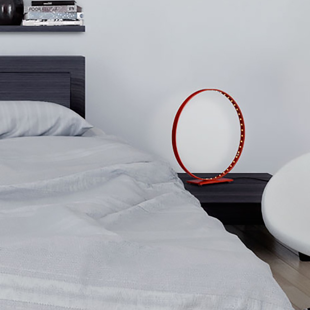 Le cercle et la base de cette lampe à poser est en acier et est disponible en 3 couleurs : noir, blanc et rouge.