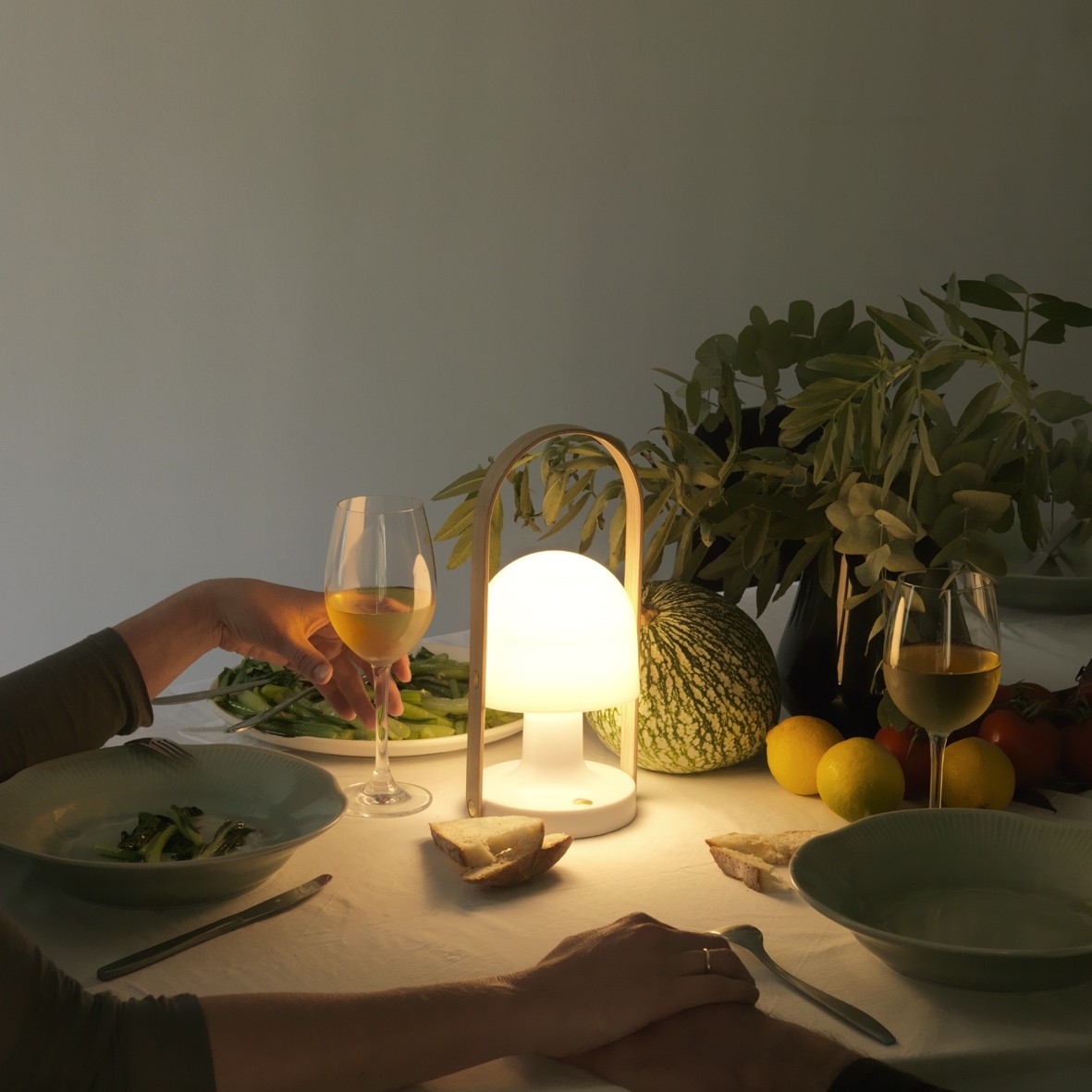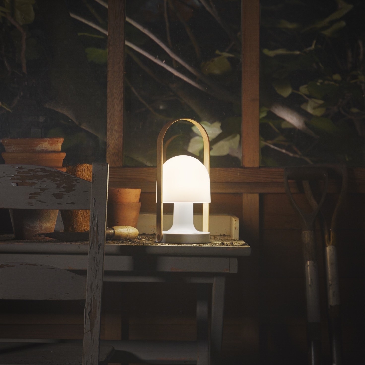 Le corps et le diffuseur de FollowMe sont en polycarbonat blanc opal, la anse est en bois chêne.