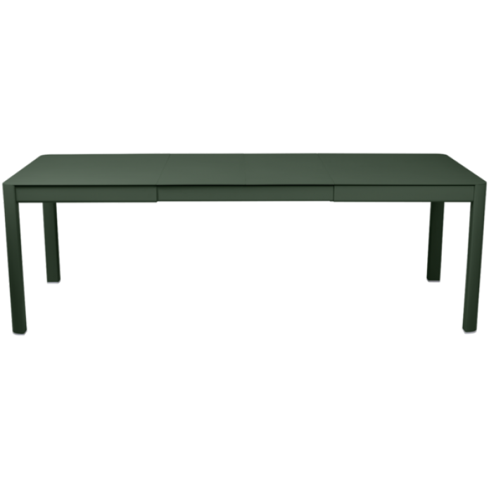 Modularité oui, mais invisible ! Sans allonge, avec 1 ou 2 extensions, rien ne vient entraver sa ligne harmonieuse. Mise au point par les équipes Fermob, l'extension est facilitée par un système téléscopique avec mécanisme sur roulements, l'installation des allonges simple et leur rangement pratique grâce au coffre intégré sous le plateau.