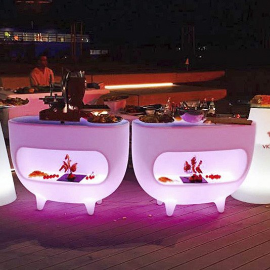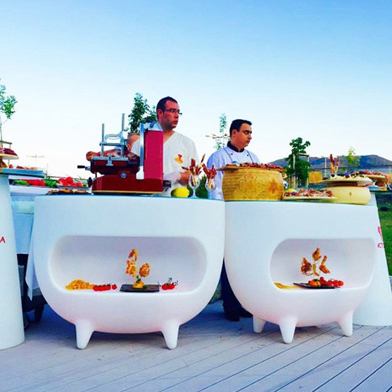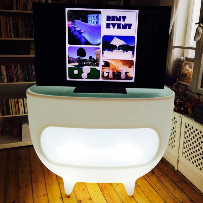 Le comptoir peut être utilisé comme module de banquet / traiteur pour des évènements spectaculaires ou tout simplement comme bar. Splay est équipé d’un élégant plateau en verre et est aussi disponible avec une finition laquée ou dans sa version lumineuse avec des ampoules à économie d’énergie ou illuminé avec la technologie LED RGB.