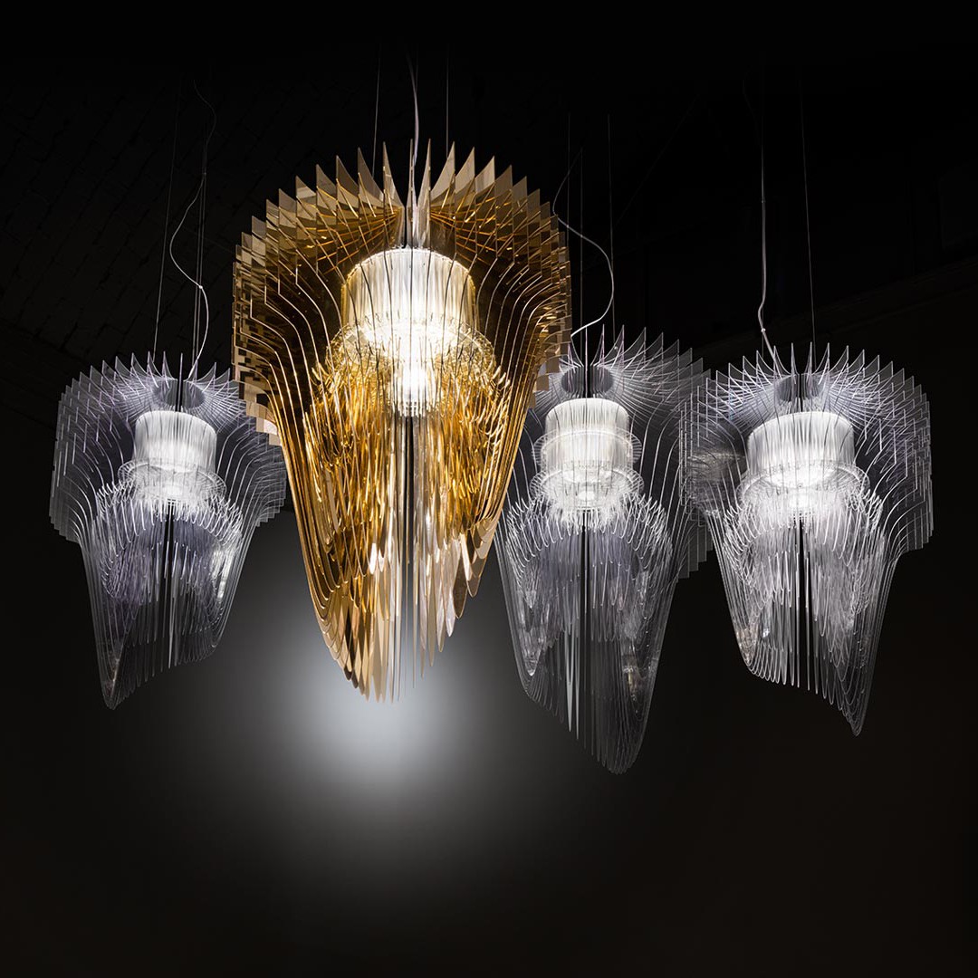Les chefs-d’oeuvre de Hadid se composent d’une structure radiale faite de 50 couches toutes différentes les unes des autres qui entourent la source lumineuse à LED en créant un volume en trois dimensions.