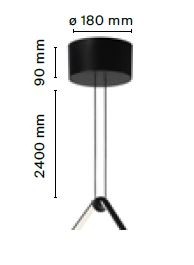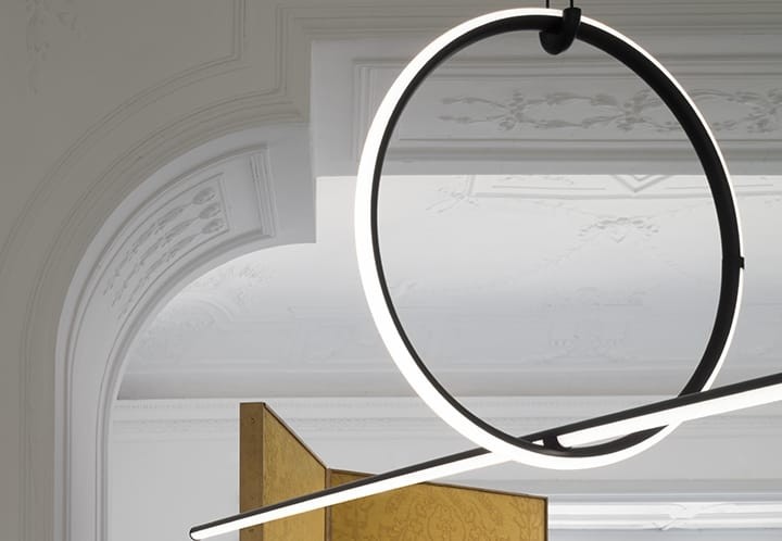 Suspension à lumière diffuse. Corps en aluminium extrudé, courbé, travaillé en CN et recouvert de peinture poudre noire, diffuseur en silicone optique platinique. Chaque élément peut être connecté à l’alimentation par un système de connexion électrique et mécanique étudié pour construire des configurations personnalisées. Rosaces disponibles avec deux puissances : pour lampe de puissance inférieure à 70W et pour lampe de puissance inférieure à 190W. Il existe également des rosaces de classe III pour des installations avec alimentation à distance : version “surface” pour une installation sur béton, version “recessed” pour faux-plafond en placo-plâtre. L’électronique intégrée dans la rosace permet d’utiliser des systèmes de variation : push, 1-10V, potentiomètre, DALI. Si aucun de ces systèmes n’est présent, il est possible, lors de l’installation, de régler le flux lumineux avec le système push inclus dans la rosace. Longueur des câbles 2,4 m.