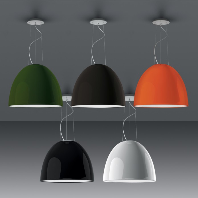 Le corps de Nur d’Artemide est en méthacrylate coloré. La calotte à la partie supérieure de la cloche est en verre sablé permettant de laisser filtrer la lumière vers le haut offrant ainsi également un éclairage indirect.