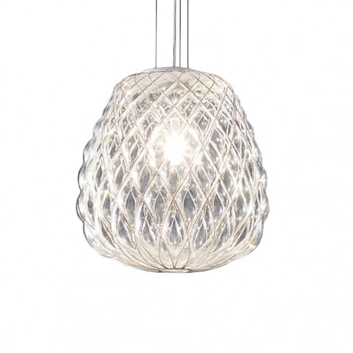 Pinecone est une famille luminaire caractérisés par un diffuseur en verre soufflé, disponibles dans la version transparente brillante ou en blanc lait acidé.