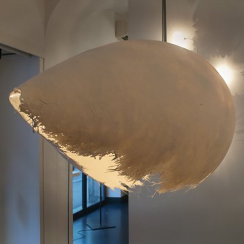 PostKrisi Suspension est une suspension simple est magnifique qui emprisonne la lumière dans son diffuseur et sculpte son ombre dont l’effet est amplifié par des écrans effilochés.