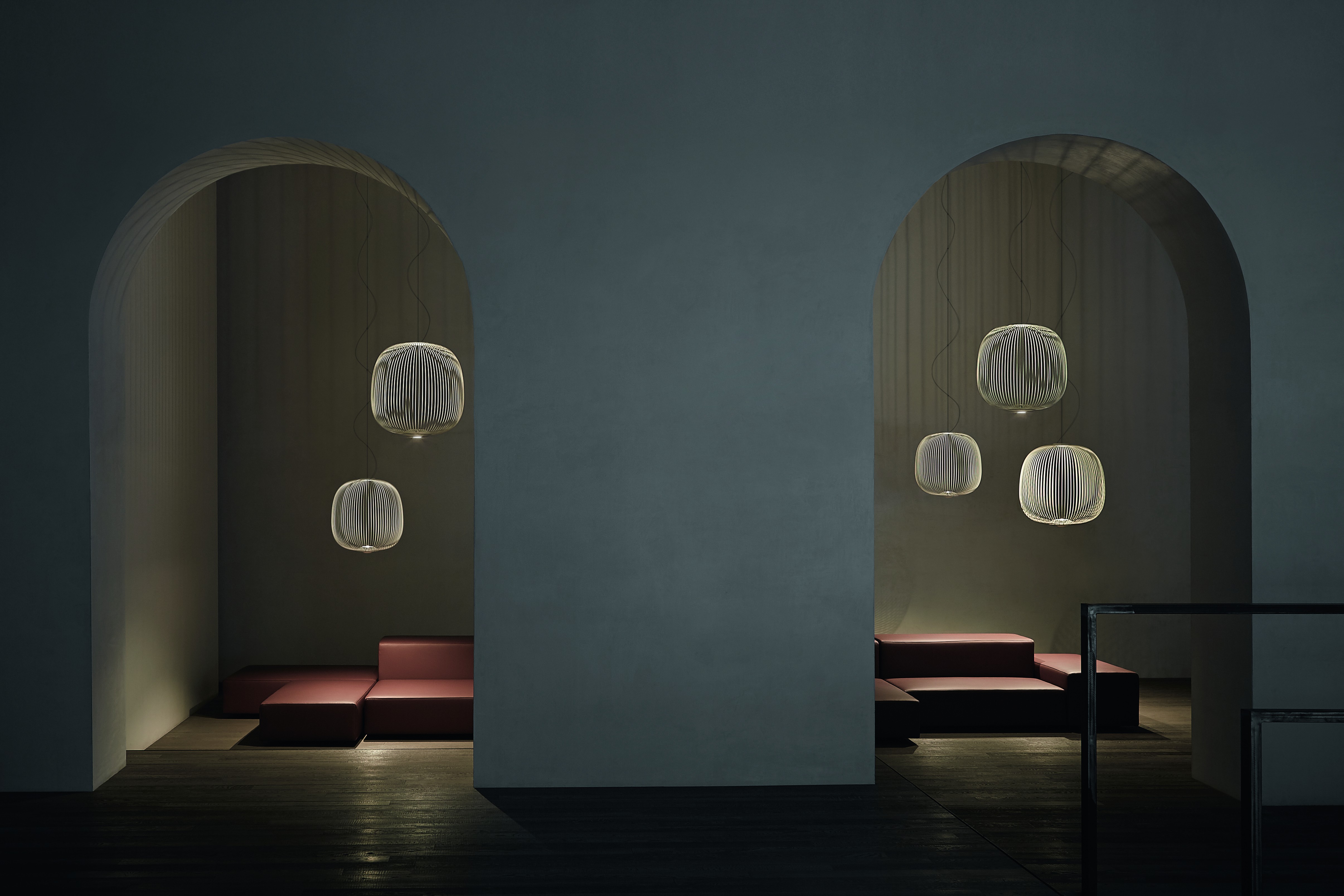 Les fils métalliques qui composent Spokes suspension de Foscarini expriment une sensation de légèreté et de dynamisme tel le mouvement hypnotique d’une roue de vélo.
